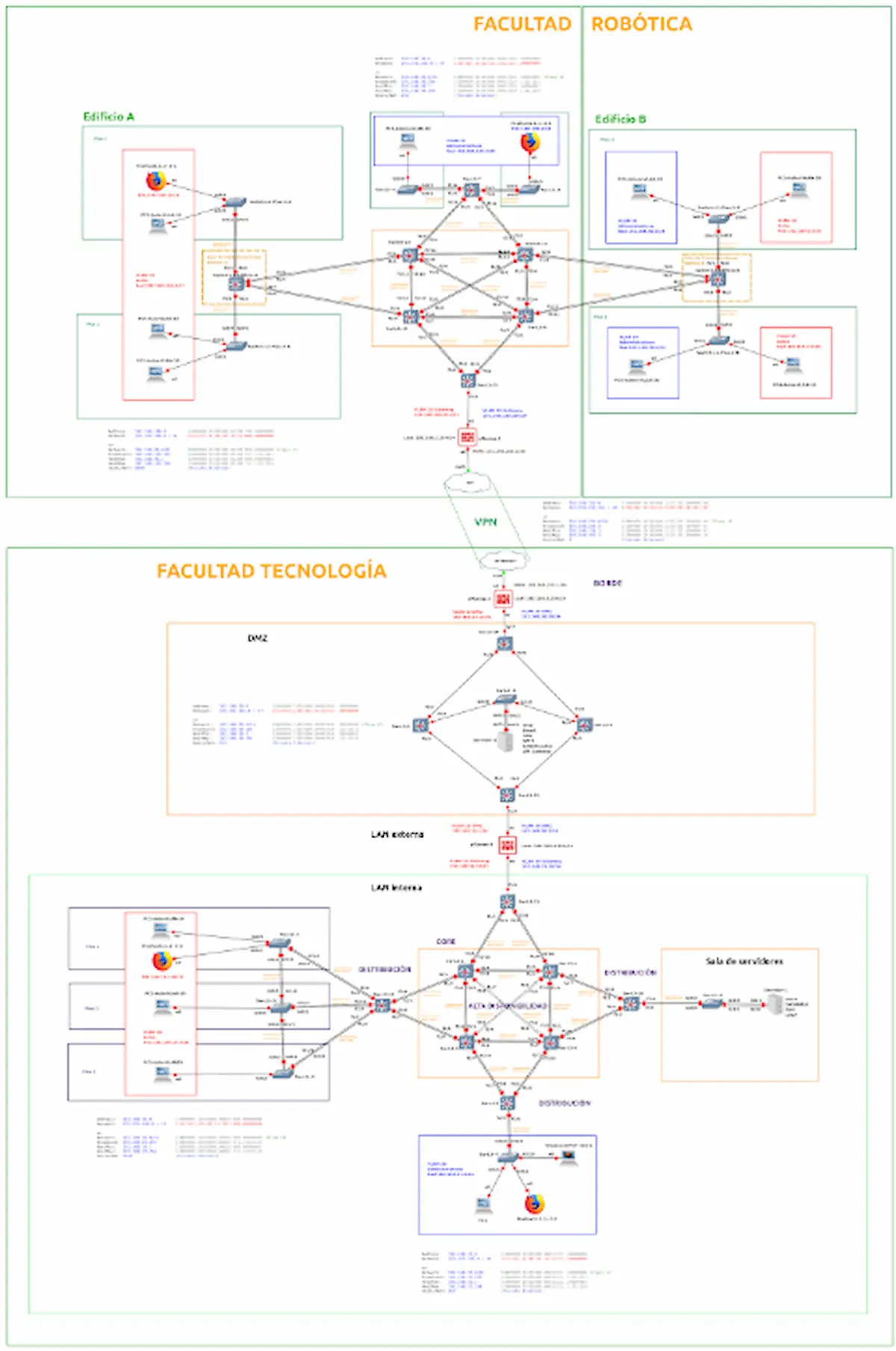 Implemented a 3-tier network architecture (Access, Distribution, Core) with VLANs, OSPF, and VPNs connecting to a Data Center. Built a Java-based management system connected to an Oracle DB and an Android App (Kotlin) consuming secure REST APIs. Managed security policies and active directory environments within a DMZ.